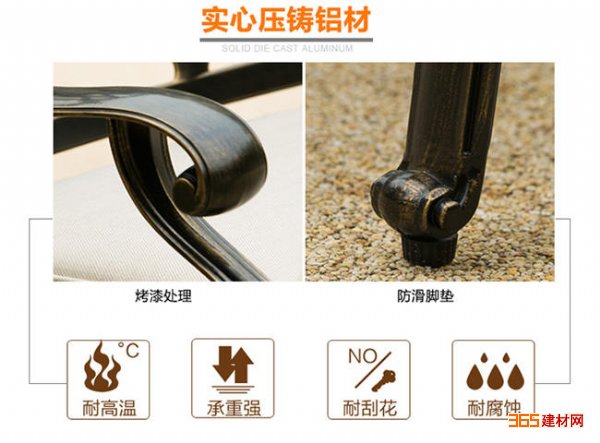 欧式古典风格,简约时尚,流线型的设计加之伞孔的设置,铸铝桌椅外观比较欧式化,铸铝桌椅质轻坚固,防水不生锈,搭配