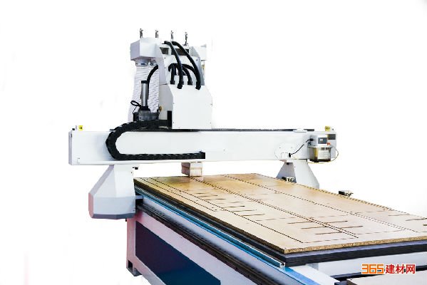 板式家具柜体和门板雕刻造型而生的一台多功能开料雕刻一体机。该机型配备四个大功率切削电主轴,具备开料、开槽、打孔、雕刻功能,配置相应规格的刀具