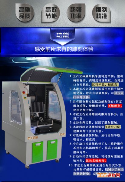 (3)现代玉石雕刻对数控雕刻系统提出了更高的要求,无论从算法还是更人性化的功能性,要求都更高,比如:新一代中工玉石雕刻机S300,整机有外
