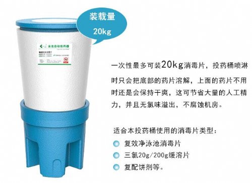 是专门用于投加固体消毒片的投药器,也叫泳池自动加药桶,其采用的固液分离、即用即溶、桶内负压、水隔式密封等技术手段,使得投药器非常适合用来自动投加固体消毒片,并且在投放过程中不会有氯味溢出,使得加药再也不会感到不适。另外它还有一个特点,就是装载量大,一次性可装20kg的消毒片,可用的消毒片有复效净泳池消毒片、三氯20g/200g缓溶片、复配饼剂等。
