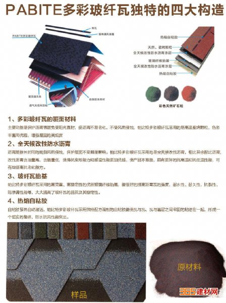 主要功能是保护沥青表层免受阳光直射,使沥青不易老化,不受风雨侵蚀,天信多彩玻纤瓦采用的是高温瓷烤颗粒,色彩丰富而优雅,增强屋面的美观度,且**褪色。