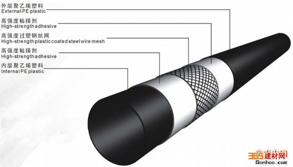 聚乙烯(hdpe)为基体,并用高性能的粘接树脂层将钢丝骨架与内外