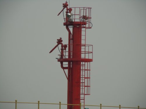 5.在通常情况下,消防炮塔为双平台,上平台安装泡沫炮,下平台安装水炮;也有三平台(或多平台)消防炮塔,上平台安装泡沫炮,中平台安装水炮,下平台安装干粉炮。这主要是根据泡沫、水、干粉等不同灭火剂各自的喷射特性以及泡沫炮的炮筒较长等因素决定的。为保证泡沫炮的喷射效果,将其放置在上平台是有利的、必要的。正是由于泡沫炮的炮筒较长,其仰角和俯角均较大,安装在层高间隔较小的下层平台有困难,故需安装在*上层平台。