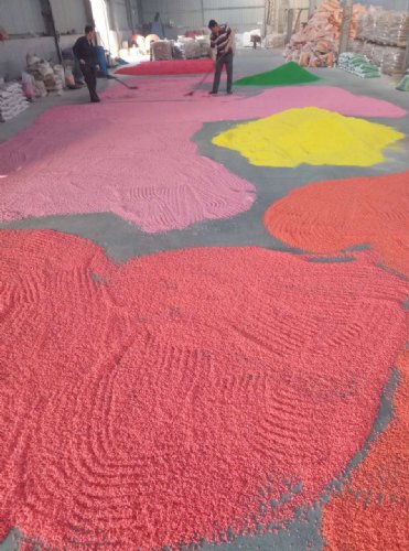 是选用天然白色砂子经过高温烧结染色而成,具有色彩多样,颜色艳丽,不褪色,耐高温,耐冲刷等特点,龙坤矿产品生产的染色