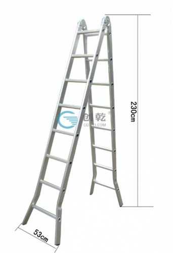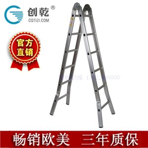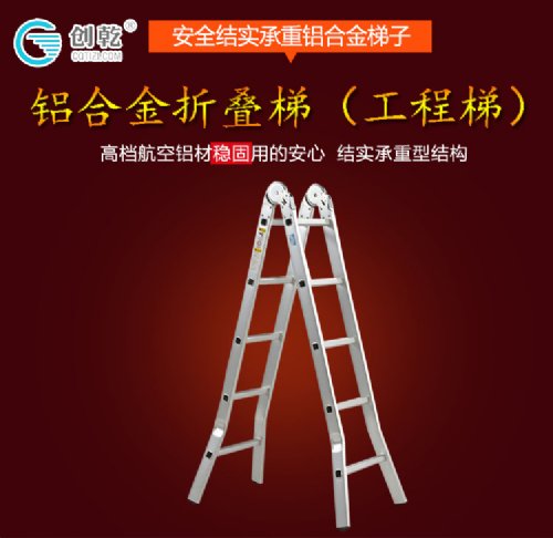 此款为两用折叠铝梯,八字弯脚着地力更强,创乾第六代改良大关节,破坏性检测375KG,工厂直销。