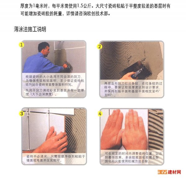 胶水重复使用。 3、齿型刮板将胶浆涂抹于墙面或者是瓷砖背面上,均匀分布约一平方米左右,在十五分钟之类将瓷砖揉压于上即可。如需调整,需在
