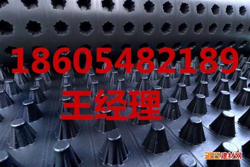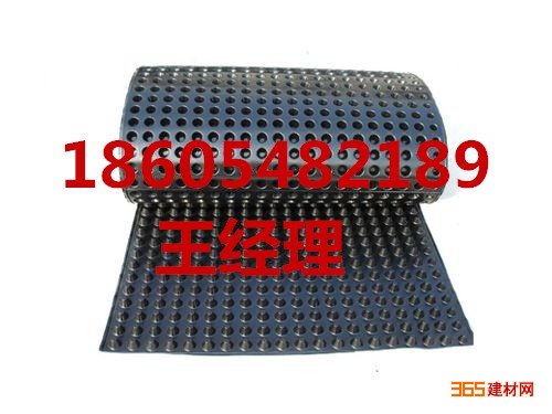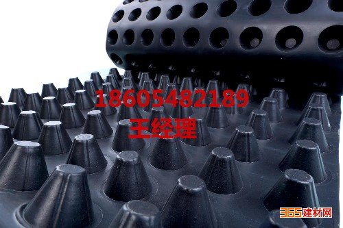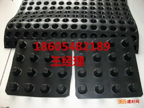 聚乙烯(hdpe)塑胶底板经过冲压制成圆锥突台或者加劲肋的凸点(或中空圆柱形多孔)而成,幅宽有3米,长度有10米或者是15米。