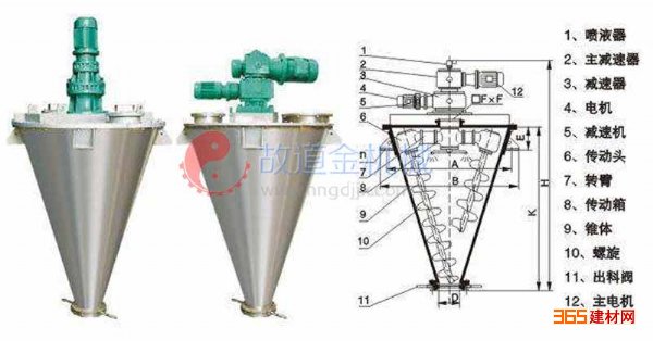 混合机的搅拌部件为两条不对称悬臂螺旋,长短各一,他们在绕自己轴线转动(自转)的同时,还环绕锥形容器的中心轴,借助转臂的回转在锥体壁面附近又做行星转动(公转);该设备通过螺旋的自转、公转将物料反复提升,在锥体内产生剪切、对流、扩散等复合运动,从而达到混合的目的。产品可根据要求设计外夹套(加热、冷却),喷雾器,广泛应用于化工、医药、农药、燃料、建材等粉体与粉体的混合、反应。该机可根据工艺要求在混合机筒外增加夹套,通过向夹套内注入冷热介质来实现对物料的冷却或加热,冷却一般加入工业用水,加热可通入蒸汽或电加热导热油。