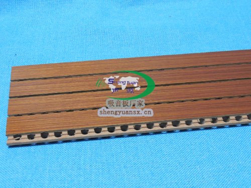 密度板的正面开槽、背面穿孔的狭缝共振吸声材料;通常用于墙面装饰和吸声降噪。