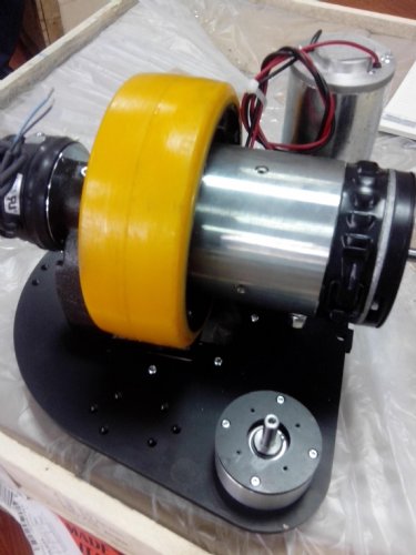 电机和传动箱组合,反对称安装方式。这种方式可以在使轮对同轴,提供较大动力(通常电机外形尺寸和功率成一定比例)的情况下,大大缩短轮距,节约空间,以使机器人体积小型化。由于采用这种安装方式,电机的选择就可比较广泛,