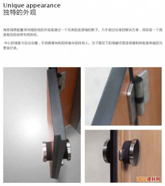 独家设计说明:海格瑞恩卫生间隔断以质量与创新相结合,从选材到成品每一个环节我们都严格把关,有了质量作为强大的后盾,在产品外观设计上我们设计师总让你露出惊喜,在卫生间隔断领域我们成为真正的缔造者!