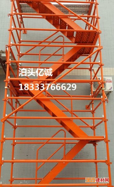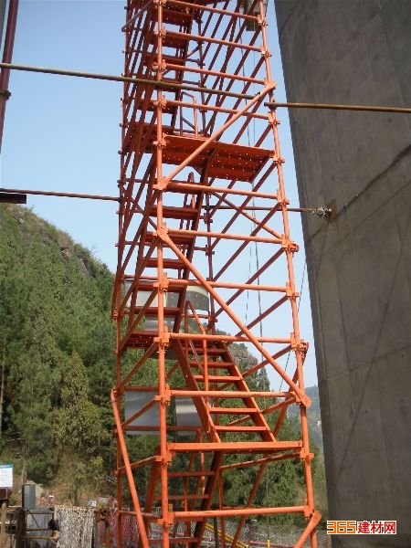 脚手架,然后将配套的楼梯放在用于安装楼梯的横撑上就可以安装完成了,加上适当的附着(每隔6-9米做一层附着,根据高度适当调节附着间距)后就可以放心使用了。