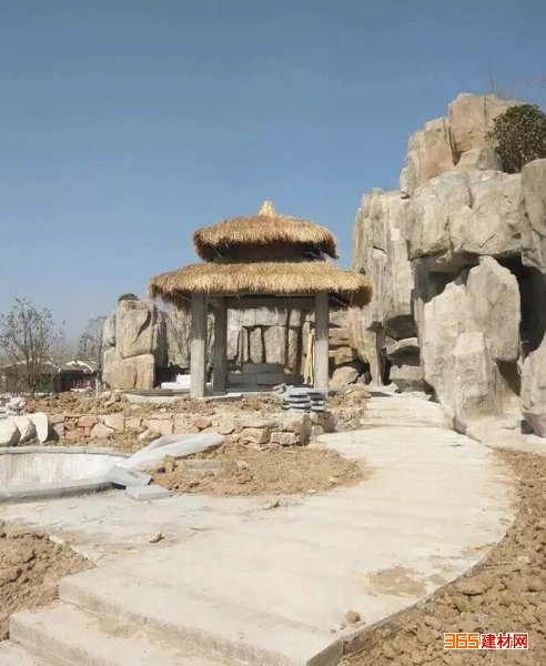 3.屋顶/屋脊的铺装:将编织片茅草裁剪成300-500mm/片(只是裁剪编织条,不裁茅草),中点定在屋脊/屋顶,竹片编制条两端往屋面折,将其固定在屋面即可。若有圆柱型屋顶,则可将茅草从竹片编织条内拆出,用麻绳穿串,然后沿圆柱体外面捆绑即可。