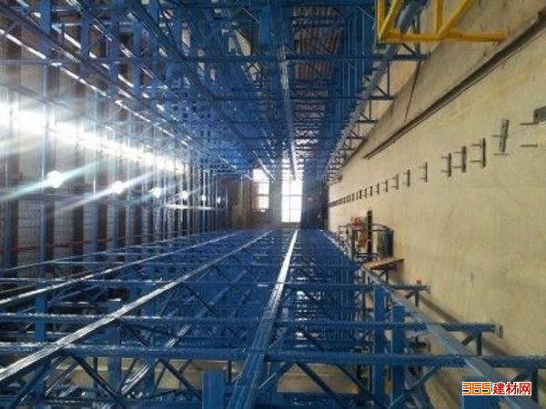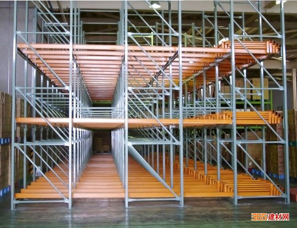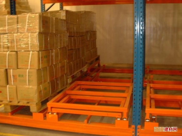 货架——是在前后梁间以多层台车重叠相接,从外侧将叠栈货物置于台车推入,后储存之货品会将原先货品推往里面。