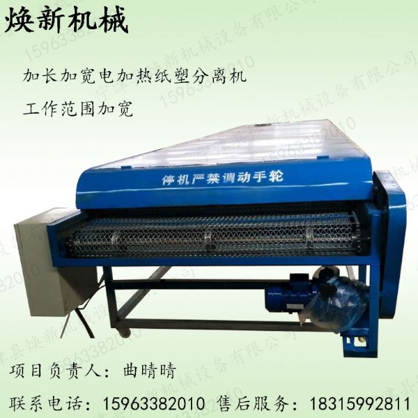 纸塑复合袋,纸塑复合编织袋的可分离不仅对资源再生和环保事业有着重要意义,而且对从事这个行业的人来说也是一条生财之道!目前国内对纸塑复合袋的分离采用干法和湿法两种。湿法的纸塑分离产量较高,但用电大、投入大,需要的场地大、人员多,而且经湿法分离的PP编织料用于再生造粒质量较差,故售价低;而且,分离出来的纸浆或压成的纸板,难卖,价格也不高。加上环保管理严格,麻烦不断。干法纸塑分离大多采用土办法烘烤,有的用煤烧,有的用木柴烧,不仅产量低,而且由于温度不均匀,达不到理想的效果。目前国内也有一两家生产干法纸塑分离机,但仍旧未解决高速度、高质量、方便快捷,可机械化生产的问题。在此基础上,我们潜心研究,首先解决了电加热装置问题,不仅简单方便,而且升温快、不易损耗温度,受热均匀;其次解决了耐高温传输的机械装置问题,不仅稳妥、速度快,而且使用寿命长。 该电加热干法纸塑分离机,只需4个工人操作,可分离纸塑复合袋1吨(5000只)以上。现在更有新型6米.8米纸塑分离机设备,机器安装简便,操作简单,速度快,安全性能好,经济效益高。热忱欢迎广大有识之士来人、来电参观、洽谈、购买!