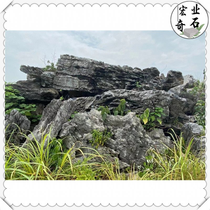 英石属沉积岩中的石灰岩,主产于广东北江中游的英德山间。该地岩溶地貌发育较好,山石较易溶蚀风化,形成嶙峋褶皱之状;兼之日照充分、雨水充沛,暴热暴冷,山石易于崩落山谷中,经酸性土壤腐蚀后,呈现嵌空玲珑之态,英石本色为白色,因为风化及含杂质(如金属矿物铜、铁等)而出现多色泽,有黑色、青灰、灰黑、浅绿等色,常见黑色、青灰色,以黝黑如漆为佳,石块常间杂白色方解石条纹。石质坚而脆,佳者扣之有金属共鸣声。石质大多枯涩,以略带清润者为贵。英石轮廓变化大,常见窥孔石眼,玲珑宛转。石表褶皱深密,是山石中皱表现突出的一种,有蔗渣、巢状、大皱、小皱等形状,精巧多姿。石体一般正反