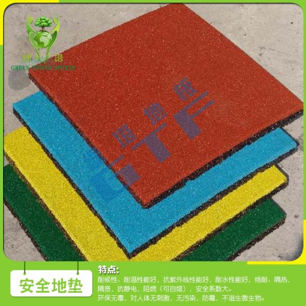 游乐设施、公园、体育馆、别墅等的地面铺设,用于增加地表的弹性、安全性、美观度和舒适性。厚度一般在1.5-2.5cm之间,通常分安全橡胶地垫和