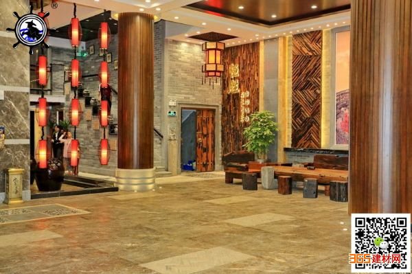 马赛克装饰,拼接成,配上具有客家文化气息的客家围楼图,大堂家具用的是老渔夫船木家具的船木