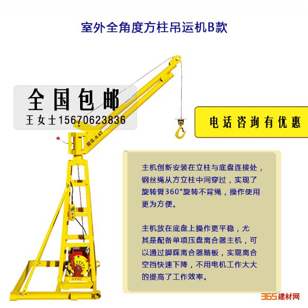钢丝绳从方立柱中间穿过,实现了旋转臂360°旋转不背绳,操作使用更为方便。
