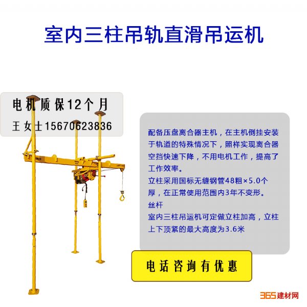 丝杆9.室内三柱吊运机可定做立柱加高,立柱上下顶紧的*大高度为3.6米
