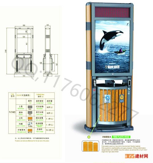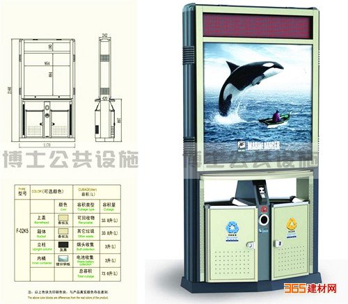 2、箱体和底座连体式设计,结构牢靠,底座可固定地上,抗打击,抗风力。独特的抽屉式斜插内桶,可实现直抽直插,自动归位,使垃圾的清理过程缩短,降低了环卫工人的劳动强度,也减少了*人力资源的配备。投入口与清理口合二为一,投入口为喇叭形,便于垃圾入箱,解决了城市美容箱长期未能解决的垃圾溢出问题。垃圾投入口处于半封闭式状态,遮阳避雨,减少了垃圾异味的散发而污染环境。压条装饰设计,更换广告画面简单,维修方便、快捷。