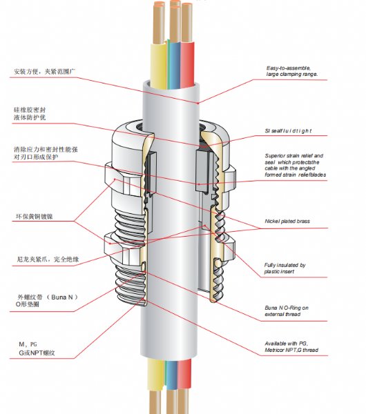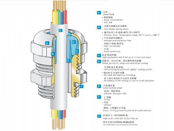 钢材质精制而成,具有独特的**功能,特殊夹紧爪与夹紧圈之设计,夹紧电缆范围大,抗拉力特强,可防水、防尘、抗盐、耐弱酸、酒精、油、油脂及一般溶剂。 防护等级 :在规定的卡口范围内,并使用