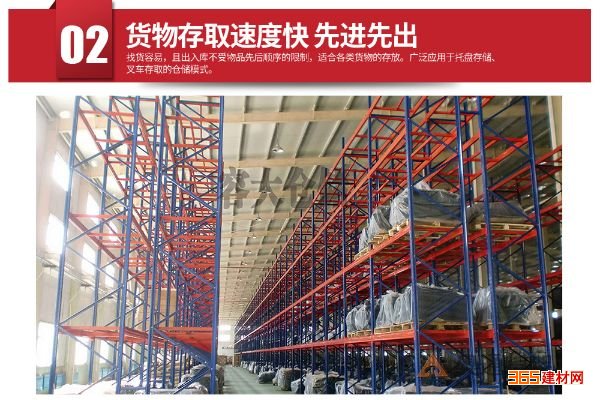 窄巷式托盘货架:窄巷式货架的*大特点就是通道比一般的横梁式货架窄得多,大概在160cm-200cm左右,大大的提高了仓库的空间利用率, 这款货架需要配置专门的叉车---三向