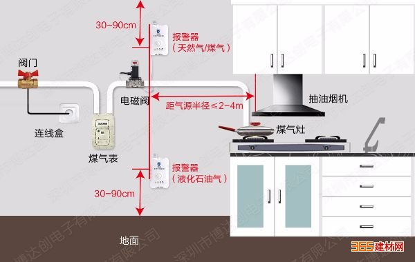 根据气体类型,选择安装位置,然后将探测器的挂板安装在墙壁上,再将报警器挂在挂板上。(天然气、沼气的密度比空气轻,探测器应装在低于