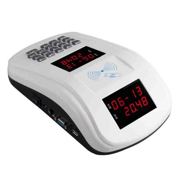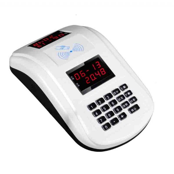 消费机安装于各售饭窗口,消费机有两个操作面,一面显示处面向就餐者,带操作键盘及显示处面向收 银员。