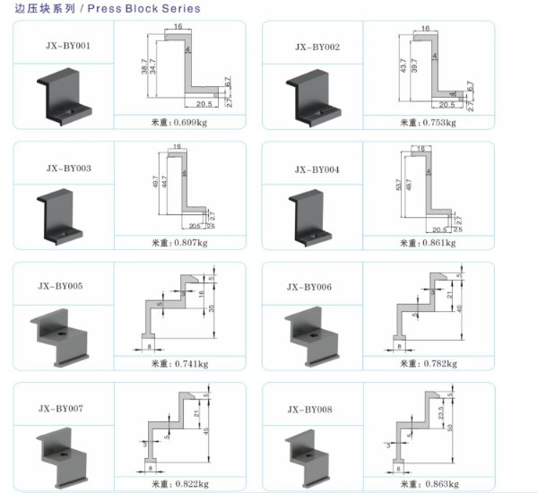 边压块、中压块 的种类可根据客户的图纸要求定做,以达到适应客户电池板的要求。设计为流线型,增加美观性。