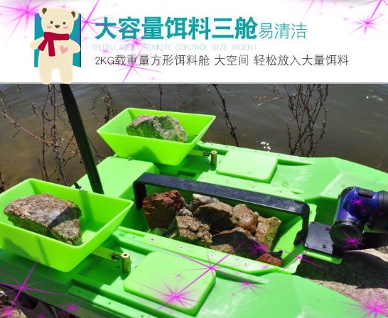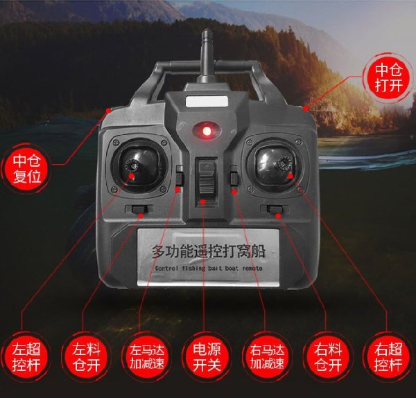 2:采用日本名牌四通道遥控器,遥控距离可达500米,转弯半径为0.8-1.0m。可完成前进,后退,左右转弯,抛投鱼饵,拖带,投放鱼钩【串钩,炸弹钩】等动作;控制更灵敏.