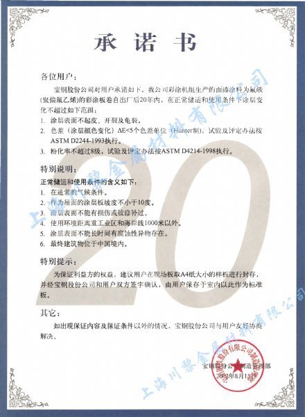 保证在15年内涂层不脱落,不粉化,不龟裂,不退色。