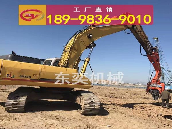 东奕挖掘机打桩机是运用振动式沉桩打拔桩,特别适用于市政、桥梁、围堰、建筑地基等中短桩工程及河道护堤、铁路基坑支护、高架基坑支护或者桥墩基坑支护等工程。挖掘机打桩机是利用其高频振动,以高速度振动桩身,将机械产生的垂直振动传给桩体,导致桩周围的土体结构因振动发生变化,强度降低。桩身周围土体液化,减少桩侧与土体的摩擦阻力,然后以挖机下压力、工字钢打桩机与桩身自重将桩沉入土中。拔桩时,在一边振动的情况下,以挖机上提力将桩拔起。挖掘机打桩机所需要的激振力要根据场地土层、土质、含水量及桩的种类、构造而综合确定。