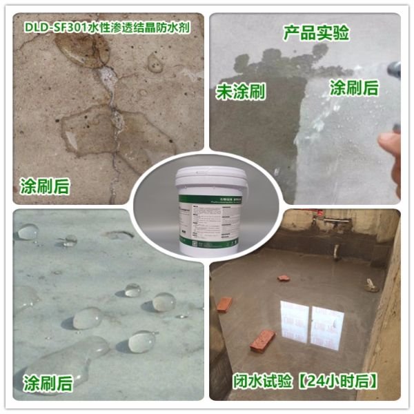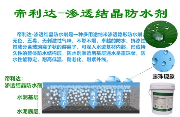 渗透结晶防水剂施工过的基面水滴自然掉落,像水珠在荷叶上一样。该材料与传统有机硅相比它可以直接喷、涂、刷在混凝土结构、石材、砖瓦、及各种硅酸盐制品及墙面上、既保持了建筑物原有风貌,有可以达到防水、抗渗、防长苔藓、防盐霜、防霉、防污染、耐酸碱效果,大大提高了防风化、抗酸雨及抗碳化能力,延长混凝土结构及制品的使用寿命。