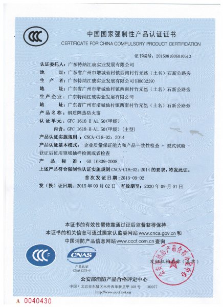是指用钢窗框、钢窗扇、防火玻璃组成的,能起隔离和阻止火势蔓延的窗。甲级窗不低于1.5小时,乙级窗不低于1小时,丙级窗不低于0.5小时。按*新规范GB16809-2008防火窗。本公司生产的隔热防火窗系列产品,严格执行国家《GB14102-2005》、《GB1609-1997》标准生产,产品经国家“公安部消防产品合格评定中心”发证认可及“国家防火建筑材料质量监督检验中心”检验合格,采用新型环保防火填充材料,本企业所生产的产品质量全面接受国家“公安部消防产品合格评定中心”及地方消防部门的严格检验和监督。