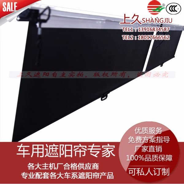 这款遮阳帘采用摇臂撑杆结构,内置棘爪回位功能,下拉过程中可以在任意位置锁位停止,拉绳控制自动回收,主驾驶与副驾驶前档遮阳帘同采用一个主架结构,分为两支可以独立操作的遮阳帘