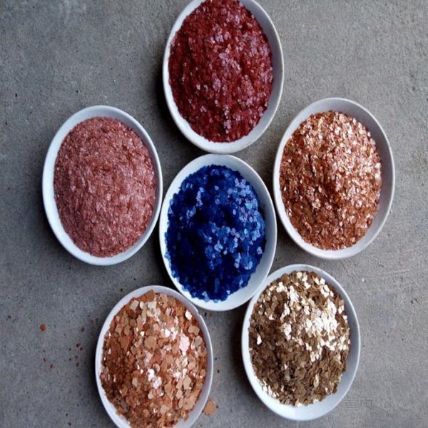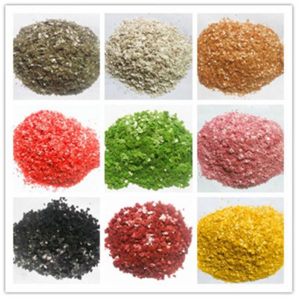 彩砂涂料等。 花色 主要颜色有纯白、银白、浅金黄、重金黄、金红、浅绿、深绿、浅黄、浅灰、茶色、红棕色、黑色、黑灰、孔雀绿等. 制造方法 多以