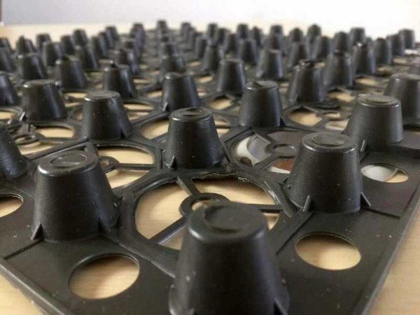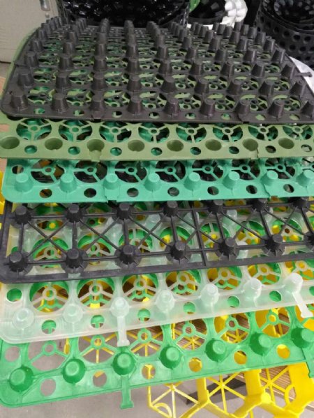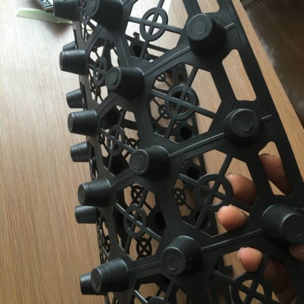 聚氯乙烯材料挤压成型,它充分利用PVC材料密度大、强度大、非晶体结构等材料特性制造而成的十字排水板。蓄排水板是采用十字支撑柱及中间增设顶柱的专利设计,利用支撑柱大平面及中间顶柱排列形式,保证覆完土后