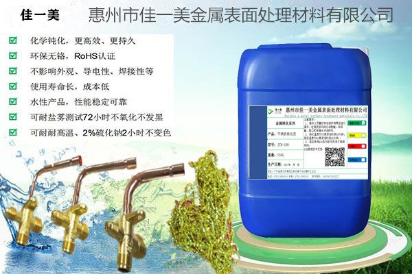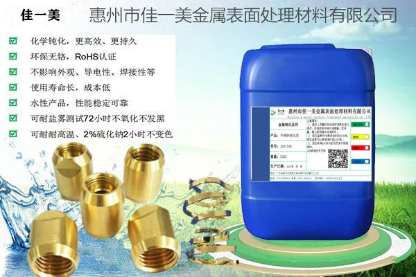产品介绍:“佳一美牌铜材钝化液”本品采用环保无机酸为主氧化剂、添加合成新材料等复配而成。针对目前对于铜材钝化一直耐盐雾不长的不足点,突破目前市场的传统配方,采用合成新材料、新工艺。目前在铜材钝化。具有铬酸、及苯柄系传统钝化无可比拟的效果。针对铜材化学抛光、电解抛光、机械抛光等表面处理后,立即进行钝化处理,将活泼金属表层转换为惰性的金属表层,可有效防止铜材表面氧化,保持抛光后的本色,提高盐雾时间。