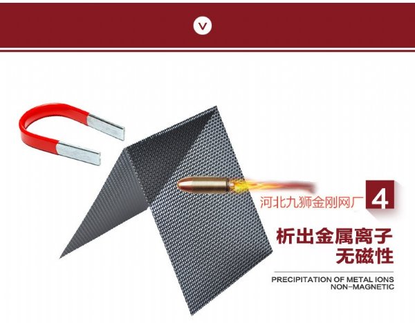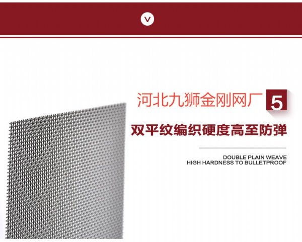 不锈钢网具有很高的防锈,防破坏能力,经检,抗创击能力达2.148吨,抗剪,抗破坏能力更强,SS是“不锈钢”的英文缩写,316L是不锈钢牌号,现市面上有304、316、316L三种型号的纱网,304含镍(Ni)8个,含碳0.08以下;316含镍(Ni)10个,含碳0.08以下; 316L含镍(Ni)12个,含碳0.03以下;含碳量越低越防腐,镍含量越高越防腐。网子的状态为铁板状,坚硬,抗撞击力超强,这是我们产品*显著特色。透光性很好:从内向外看清晰度极高,从外向内看模糊不清,可以为你营造安全舒适的私密空间,同时可以阻断蚊虫进入室内,是居室及办公场所温馨、安全、防盗、防弹的*产品。通透无眩晕感,室内向室外看如一层有色玻璃透明,室外向室内看朦胧、模糊不清。作用:抗冲击力超强,防偷盗、防弹,防蚊虫等。产品特点:网面平整,目数标准,经纬度弯曲一致,其显著特点是像铁板一样坚硬板实,是防偷盗、防弹、居家办公场所安全防护的*。