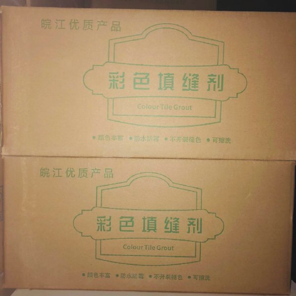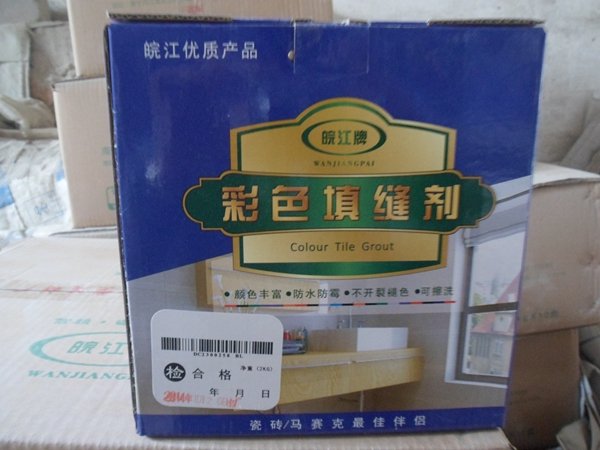5、 把彩色防水防霉填缝剂按3.3~3.5:1(粉:水)配合比搅拌均匀成无颗粒的膏糊状,待其静置3~5分钟再搅拌1~2分钟即可使用。