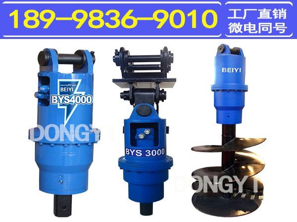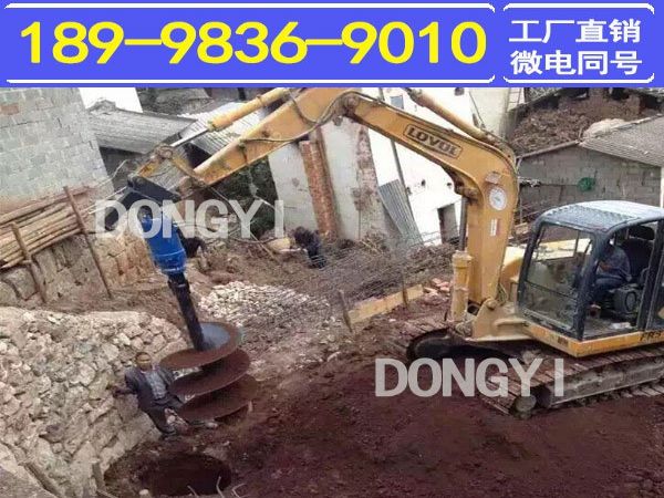 挖掘机螺旋钻机安装拆卸方便。挖掘机小臂不用拆卸,直接类似挂破碎锤一样,管路系统都可以共用,真正实现一机三用——挖、破、钻。拆卸时间和换斗时差不多。左右有摆动角度36°。当挖掘机在工地不平坦的情况下,挖机手可根据位置不同调整钻杆角度,保持90°垂直下钻,而挖改则不能调整,挖掘机是斜的就只能钻斜孔。 作业半径大。因为小臂不拆,它的作业半径至少可以比挖改延长作业半径2-3米,且平打孔、仰角打孔、竖打孔都可以实现。我们螺旋钻机可以根据不同配车进行改装,只要您提供对应的配车我们给到您合适的方案可以进行改装,产品内部给您做一个简单介绍,动力机头内部采用引进的是美国进口的马达提供足够动力,同时机头也是我们的核心产品,齿轮箱采用两层变速齿轮提供动力变速,确保齿轮正常运转,大大增加适用性,解决全球不同地方不同土质的施工现场,输出轴承采用非移位轴,确保桩孔精度和使用寿命.托架介绍:起移动托举的作用,在施工过程中避免不良操作震动带给机身损害,以上为螺旋钻机部分介绍,如果有疑问,欢迎来电咨询。螺旋钻机采用挖掘机,装载机,铲车,钩机作为动力适用于种树挖坑、电线杆坑钻孔、钻孔直径径范围为:200mm-1200mm。适用于直接钻孔立杆的工程,也适用于在坑中下卡盘的钻孔工程。该机同时适用太阳能光伏发电中支架安装时的钻孔工程,将钻杆卸下后安装特定连接头可直接用于螺旋桩的安装。同时该机也被称作为打桩机,在农村房屋改造工程中,该机可以用于桩基的钻孔。该机充分实现了一机多用的功能,大大提高了实用性。螺旋钻机,主要由驱动头和钻头组件构成,驱动头与钻头组件固定连接,钻头组件包括钻杆、包绕着钻杆的螺旋叶片、以及设置在钻杆末端的钻头,所述的螺旋叶片的底端设置有钻齿。