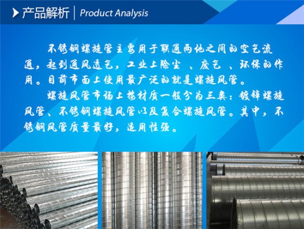 (1) 送风,包括通气,如送鲜风和排气,这个范围很广,如工厂车间,生产场地空气,由于有害气体产生需要排出室外,又需要把室外空气输送至室内。这时就要使用流量大而压力小的空气输送管道,螺旋风管就*适用,一般情况下使用镀锌铁管,有腐蚀性及特别潮湿场所使用不锈钢管。