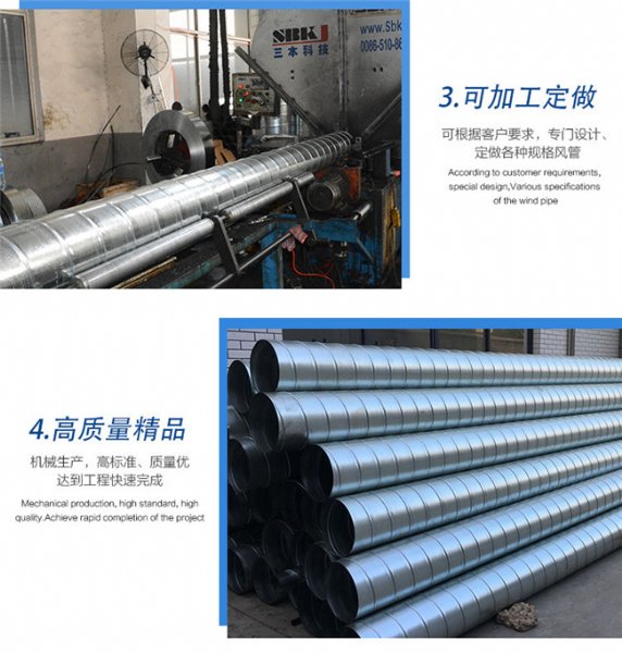 螺旋风管是用金属带料卷制成螺旋形咬缝的薄壁管,圆形,无焊接,不漏气,不漏水,多用于送风和散装物料输送,代替传统的白铁管(即手工咬缝铁管)。是风管的一种,全机制,直管无需手工敲打。
