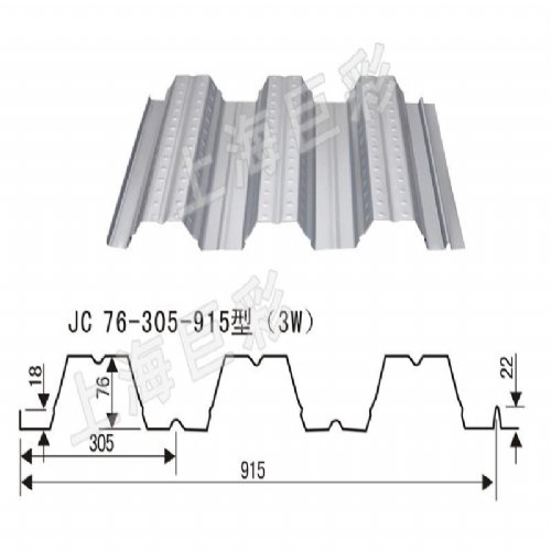 YX76-305-915开口楼承板,肋高为76mm,每个波距为305mm,成型宽度为915mm,进料宽度为1250mm,使用率为73%。它由三个波组成,简称“3W”,它的肋高较高,楼板厚度较厚,*大无支撑跨距可以做到3M多,适合跨度较大的建筑。