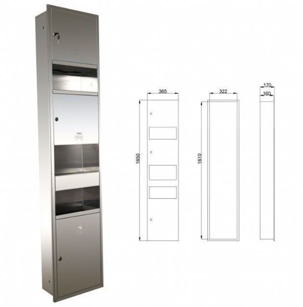 本品入墙式嵌装,使用304磨砂不锈钢材料,全点焊连接,坚固耐用;,节省空间,美观豪华;配备方便实用的安全锁。