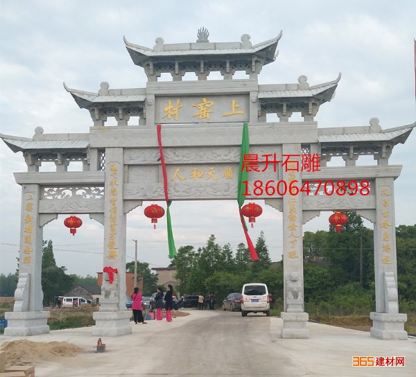 农村石牌坊村庄石牌坊石牌坊厂家, 农村石牌坊代表农村人家贫富的象征。村庄石牌坊象征着农村小康文明生活水平,在农村石牌坊的顶部有挑檐式建筑,门楣上有双面石柱上雕刻有农村对联,一般刻有“紫气东来”、“竹苞松茂”或者是村庄名字的匾额。斗框边饰有花卉和蝙蝠、蝴蝶等图案。农村街道牌坊高塘林家大宅的门楣就显示了这一特征。有的匾额还显示出该房祖先根在何处。如大碶\街道老贺村被称为“花墙门”的一清代建筑,其门楣上有“鉴湖遗风”的雕刻,在石牌坊上可见贺姓的根在绍兴。有些豪门大宅在大门左右各放一对