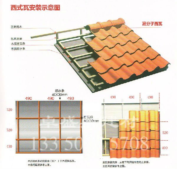 高分子琉璃瓦尺寸大,规格为570*510,4张琉璃瓦的有效面积就有一个平方,安装越来方便快捷。可直接布瓦于木结构和钢结构的屋顶,其瓦科学搭接设计和产品的性能优异,使屋顶不用做防水处理就能达到滴水不漏的效果,减少工序和成本,综合造价合理。
