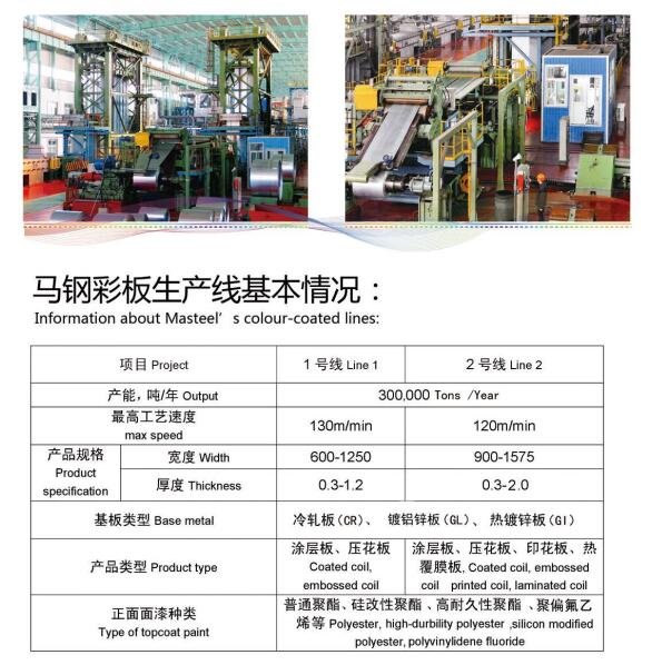 马钢彩涂板,采用热镀锌120克镀锌为彩钢板基材,正面漆膜厚度20um,反面漆膜厚度10um