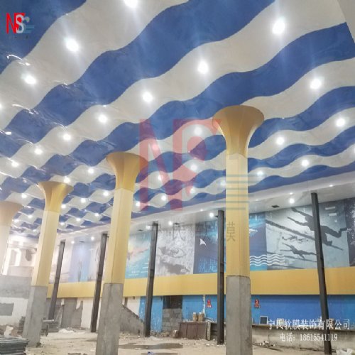 5).优越的防水耐潮性能:软膜天花表面经过防雾化处理,可免受水蒸气的侵蚀,在潮湿的空气中不易结露并无损其光华色彩。所以特别适用于游泳馆、洗浴中心等潮湿场所。